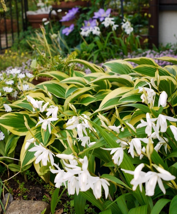 青&白の花とホスタの葉が揺れて海ののイメージに。