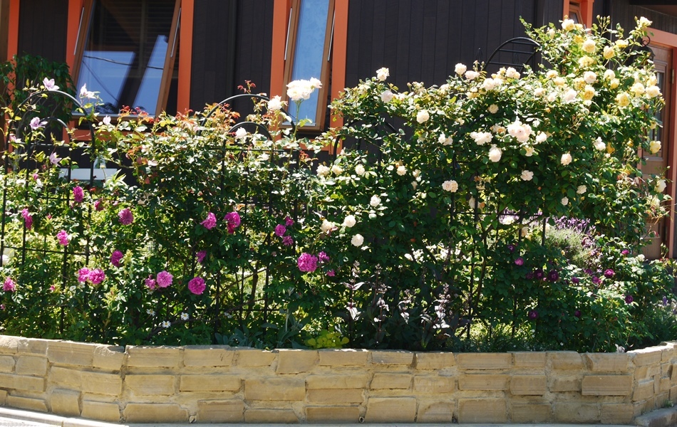 外構に夫がヨークストーンを積みました。 やっとローズガーデンらしくなりました。