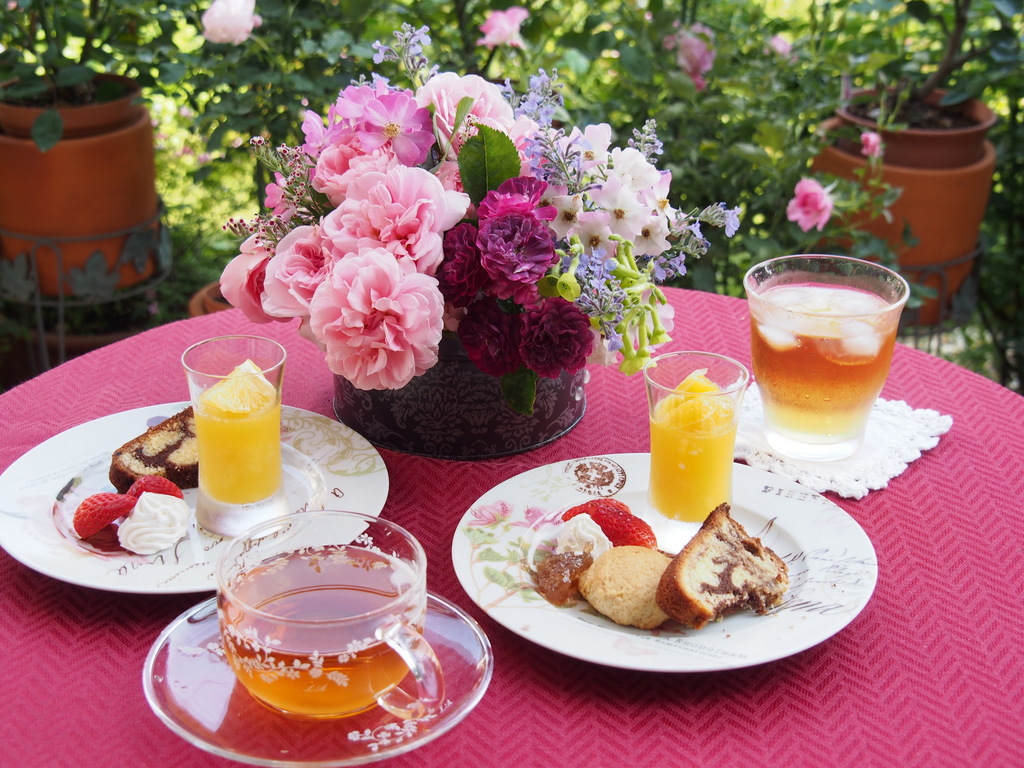 アレンジメント素敵ですね(^_-)-☆美味しいお菓子もあって最高のティータイムですね(#^^#)