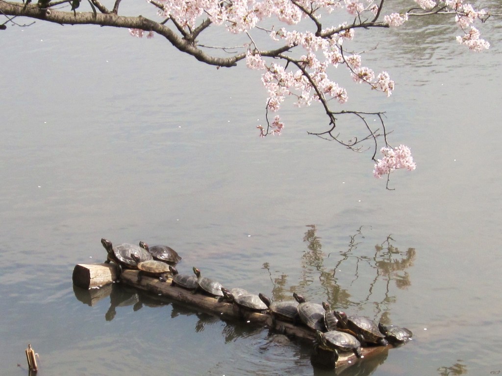 (笑)みごとに並んでますね~^^甲羅干しですね~^^ 水面に映った桜がゆら~ってしててのどかさを醸し出してますね♪
