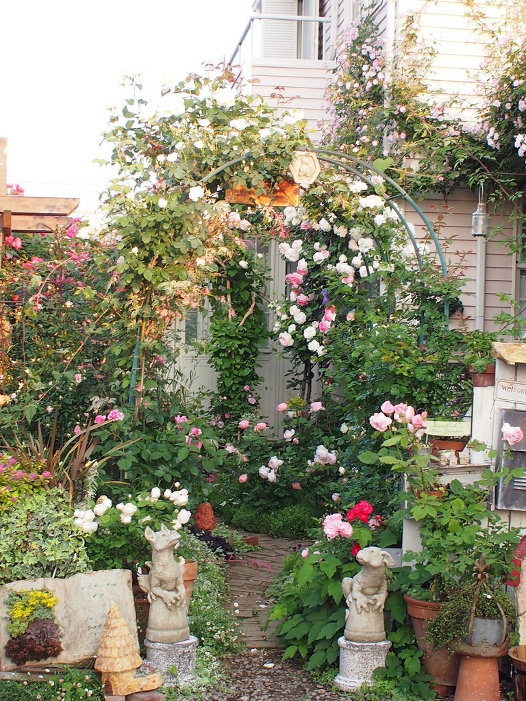 白のつるバラのダブルアーチにはセバスチャンクナイプ、アルバセミプレナ、シュネーヴァルツアー、サマーメモリーズ、スノーグース、モンジャルダンエマメゾンと斑入り野葡萄を。手作りのブックプランターととんがり屋根のお家とドラゴンがお迎えします。