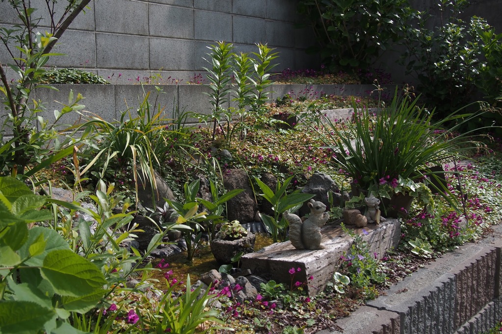 中央が小さな池になっています。昨年ハンゲショウを引き抜いて、池の淵へ置き、浮き上がらないよう石で根を押さえておきました。春になり沢山増えて、最近花が咲きました。小さな池の維持は難しく、遷移を止めることができません。ガーデニングとは、遷移を止める作業なのかと思うこの頃です。