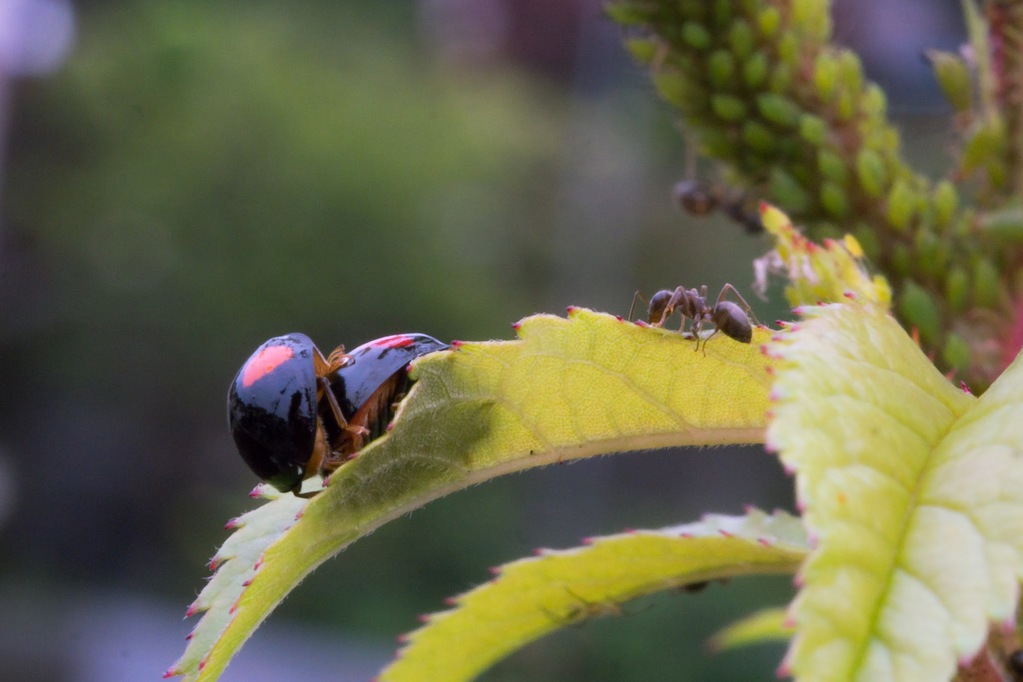 ガーデナーには説明不要の1枚(^-^) 蟻に追い払われそうになっているのに、必死に子孫を増やそうとしているてんとう虫。奧にアブラムシがビッシリと付いているの、見えるでしょうか。撮影秘話ですが、このてんとう虫さんの行為はかなり激しく葉を揺らすので、ピント合わせが大変でした。