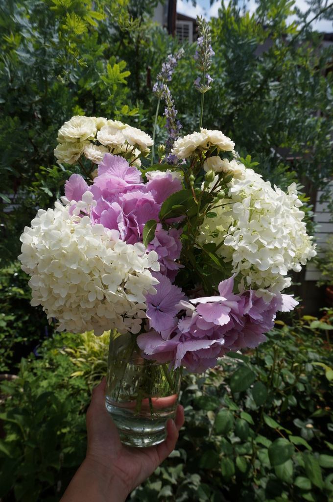 この時期になると切り花があまり日持ちしないのですが、アジサイとグリーンアイスなら喜んでもらえるかな?と、母へプレゼント(^^♪