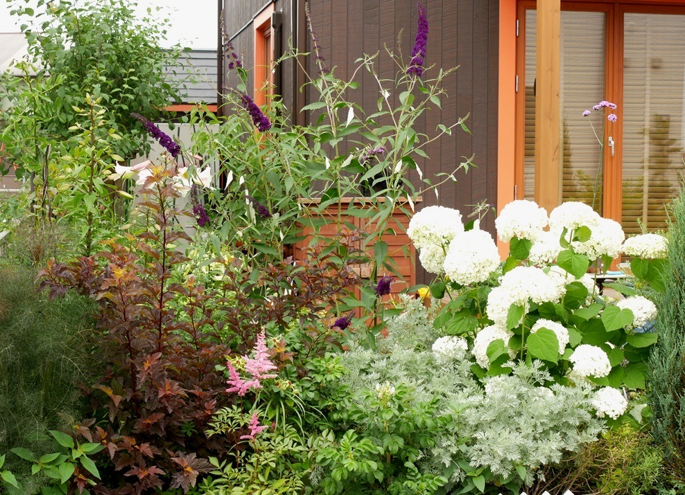 東南道路側のカラーリーフのエリアが、3年目にしてようやく形になりました。 アナベルとブッドレアが巨大に。