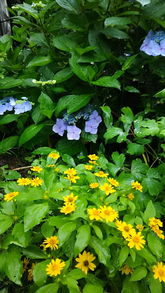 今日は朝からずっと雨です。水に濡れたメランポディウムの黄色も、大きく育ったガクアジサイの青も綺麗。