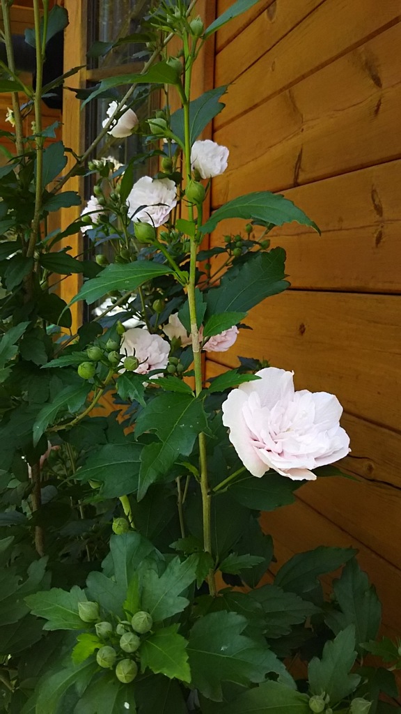 うちのピンクの八重のムクゲ、大好きな花です。今年の花芽は沢山ついています。