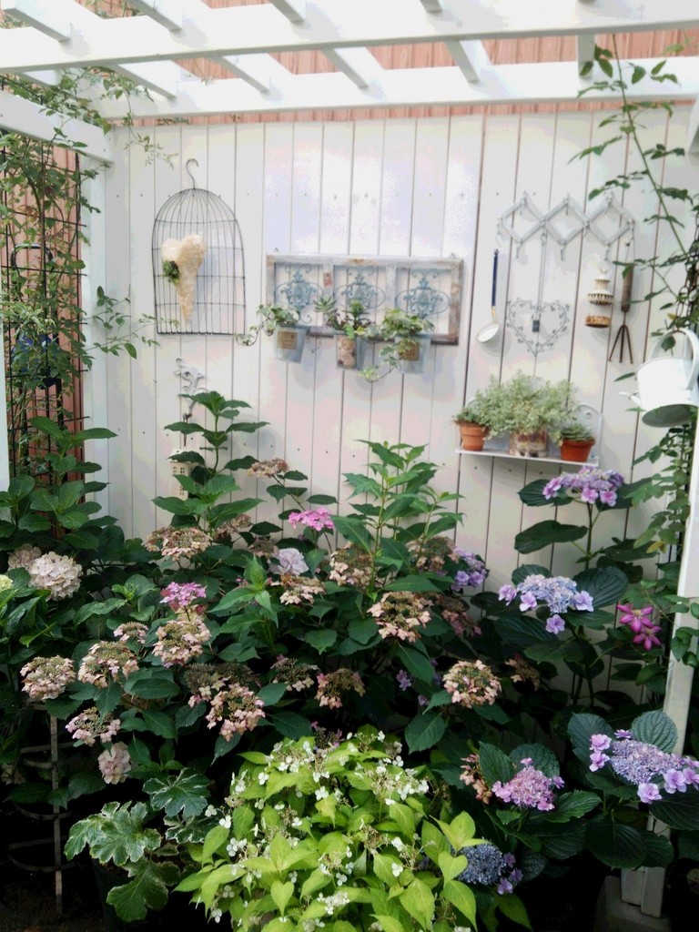 紫陽花,つるバラ,パーゴラ付きフェンス,シェードガーデン,雑貨