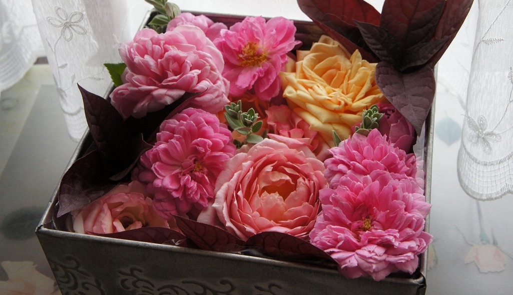 猛暑の中 咲いていたバラを摘み 箱に飾ってみました。今は、涼しい家の中でホッとしてくれたでしょうか?