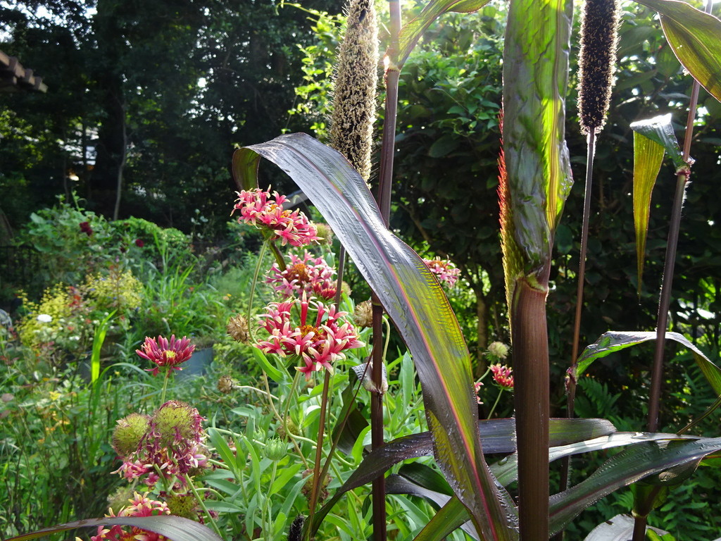 夏の庭・・猛暑日が続いています。スックと立ったミレットはなかなかカッコいい~花穂がチョコバナナになりました。