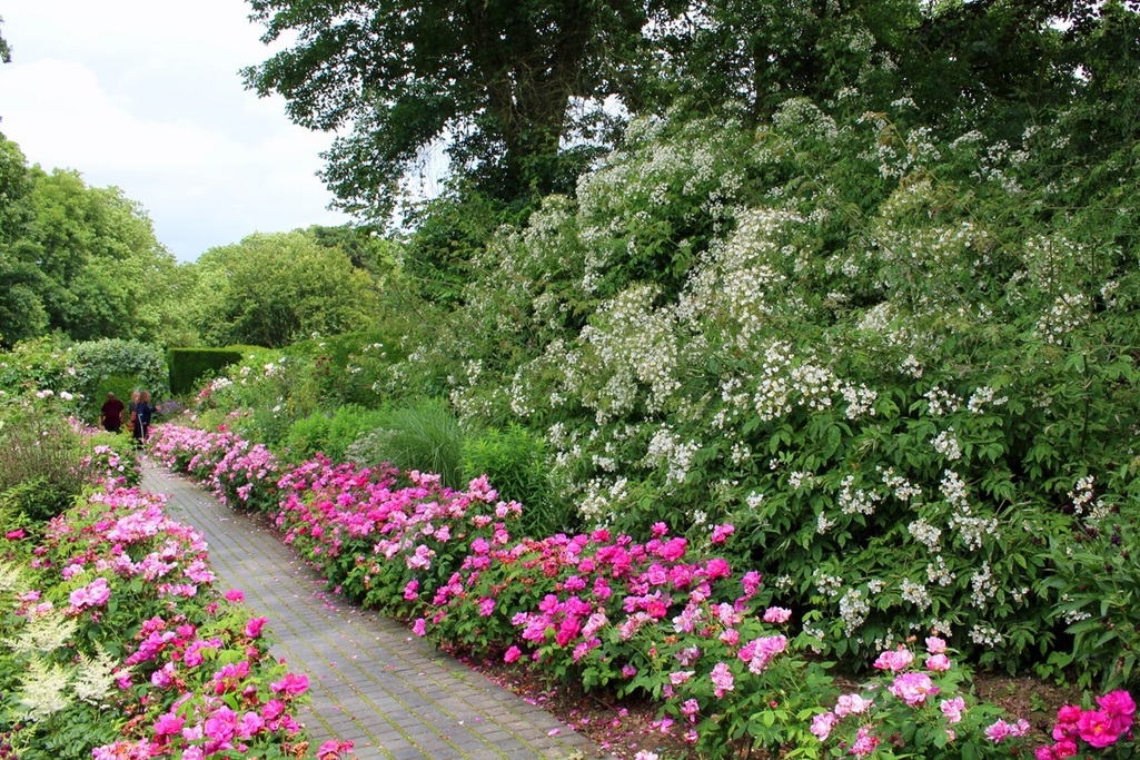 キフツゲートコートガーデンでみつかった品種Rosa filipes 'Kiftsgate'は何本もの樹木をおおい尽くして真っ白な花を咲かせていました