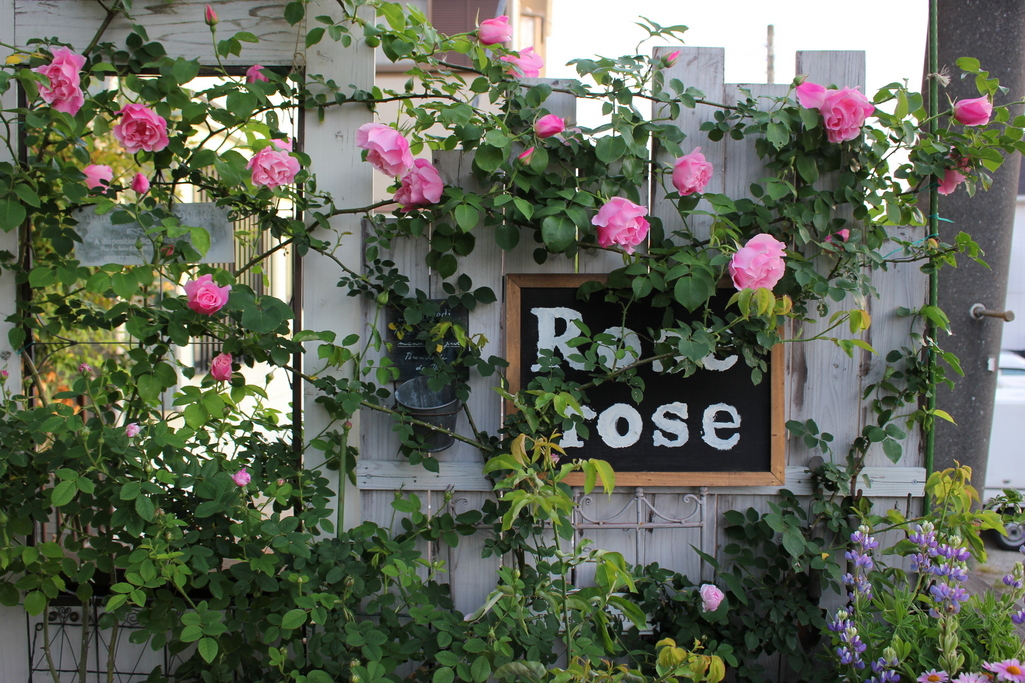 スパニッシュビューティーは鉢植えが2つ、地植えが1つあります。 鉢植えなだけに、あまり大きくはなりませんが、移動できるので便利。 これはウッドデッキの上にDIYで作った、フェイクドアとウッドボードに枝を誘引してあります。