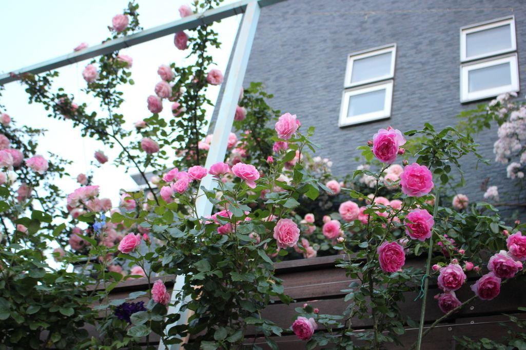 我が家のバラはほとんどピンクばかり。 ピンクの濃淡が美しく、アクセント的に紫のデルフィニュームを置いています。