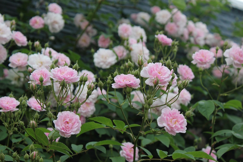我が家に一番最初に植えたバラです。 既に10m以上になっていて、壁をUターンして誘引しています。 満開の時期は圧巻の美しさです!