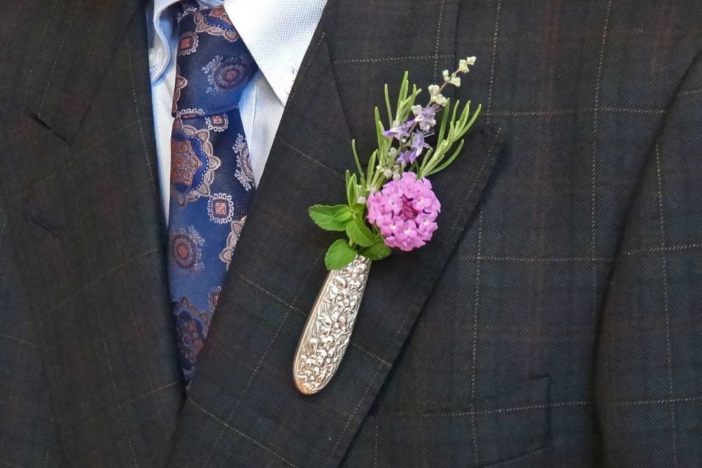 イギリスの園芸誌 GARDEN ILLUSTRATEDの6月号に「ボタンホールの花飾りの復活を! 毎日花を身につけましょう」という記事が掲載されて、たくさんの実例の写真が載りました。ちょっとやってみようと思い、シルバープレート製のフラワーホルダーを使って、庭の花を飾ってみました・・