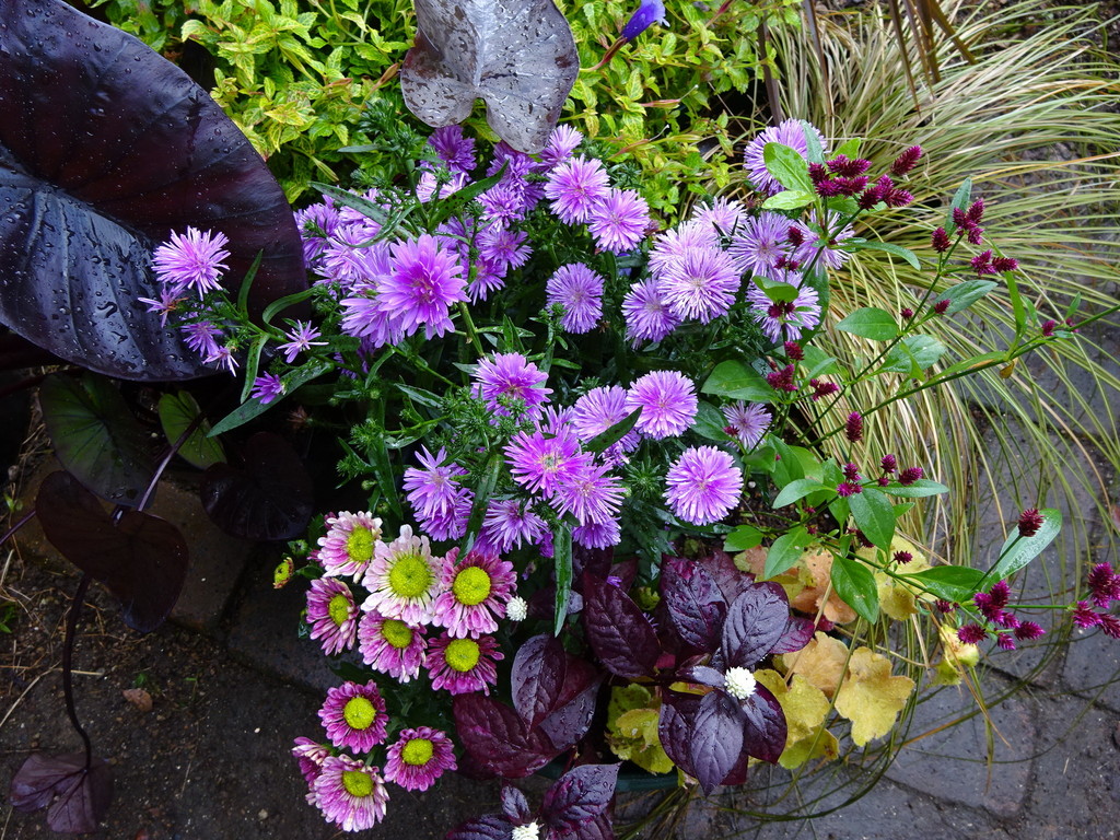 秋の寄せ植え(アスター、菊、アルテルナンテラ、千日小坊、トレニアブルーインパルス、コロカシアなど)