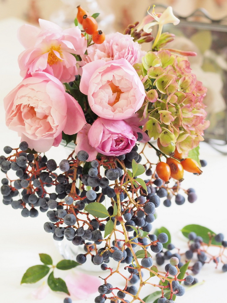 バラの実とヘンリーヅタの実、秋色になったアジサイをそえて。