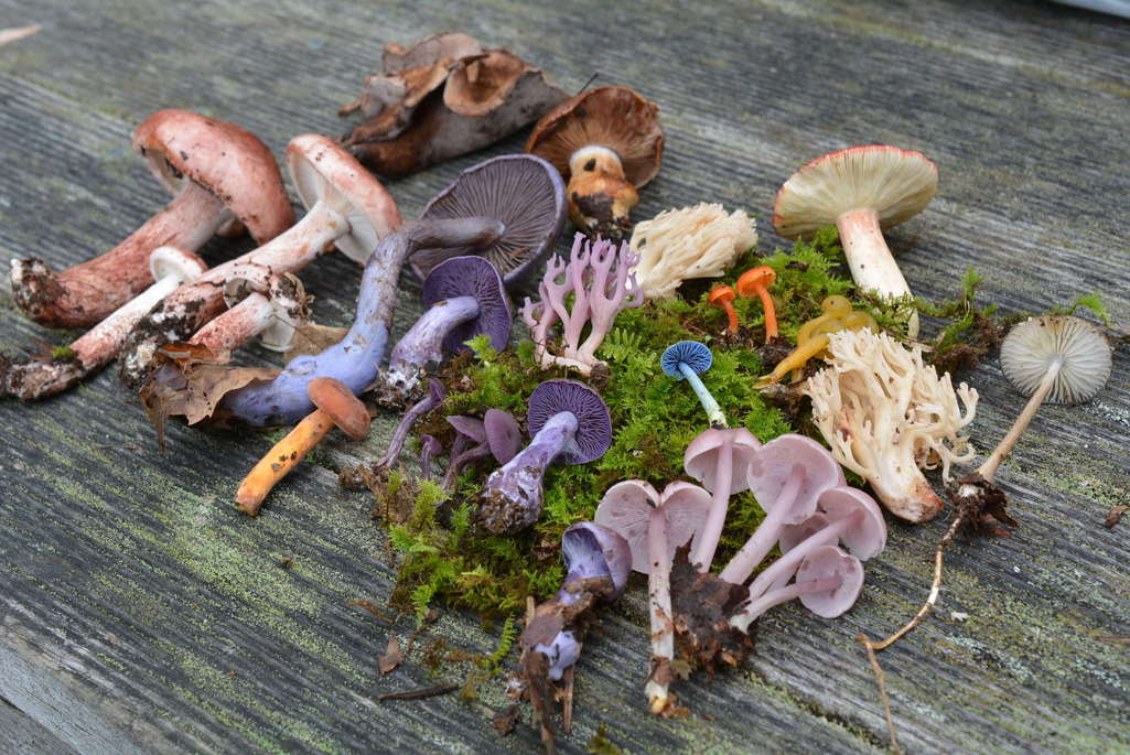 カラフルなキノコ。ソライロタケ(中央の青いキノコ)初めて見つけました。