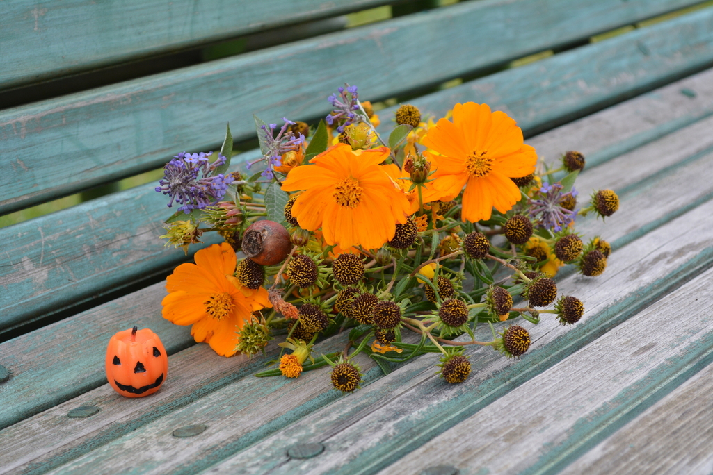 ブナの森の帰りに寄った泉ボタニカルガーデン。薔薇や花の剪定中で、切った花もらってブーケにしました。 キバナコスモス・ヤナギバヒマワリの実