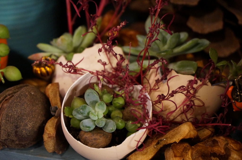 たまには多肉で何か作ってみようと、庭の色付いたコキアや椿の実・・・そして卵の殻で!!イメージはオバケの出そうな森の中です(笑)