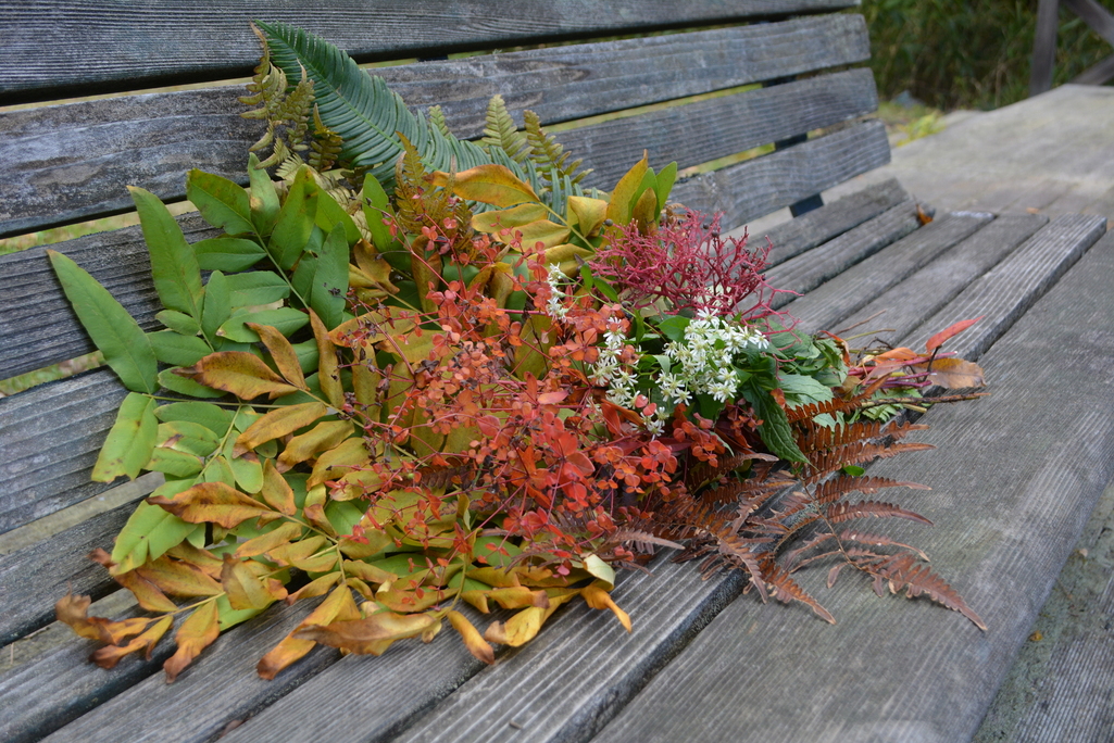 ゼンマイの黄葉、トウダイグサの紅葉 集めてブーケに
