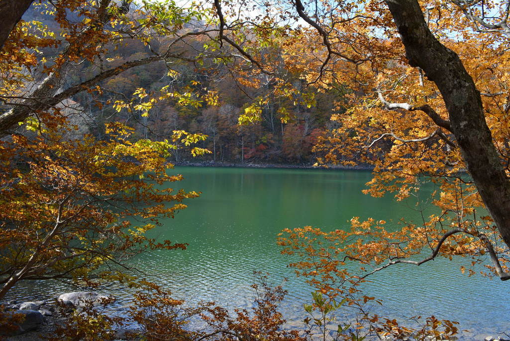 色づく木々と沼の色合いの対比がとても美しいですね。