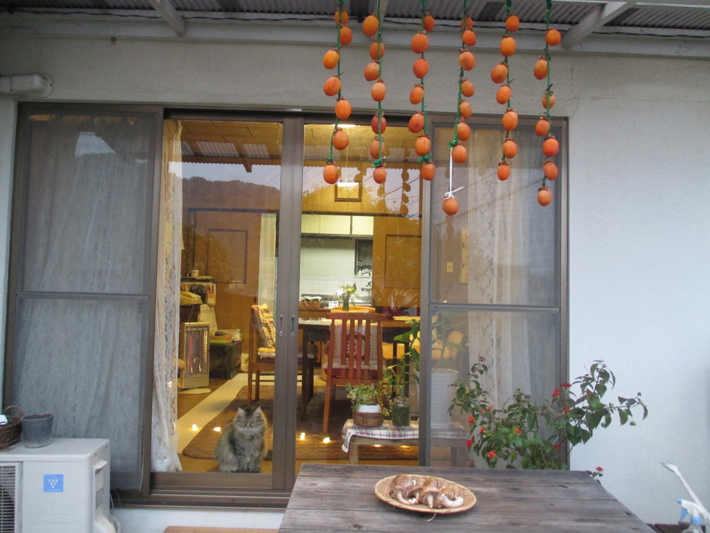 冬,干し柿,猫,夕暮れ,ランタナ