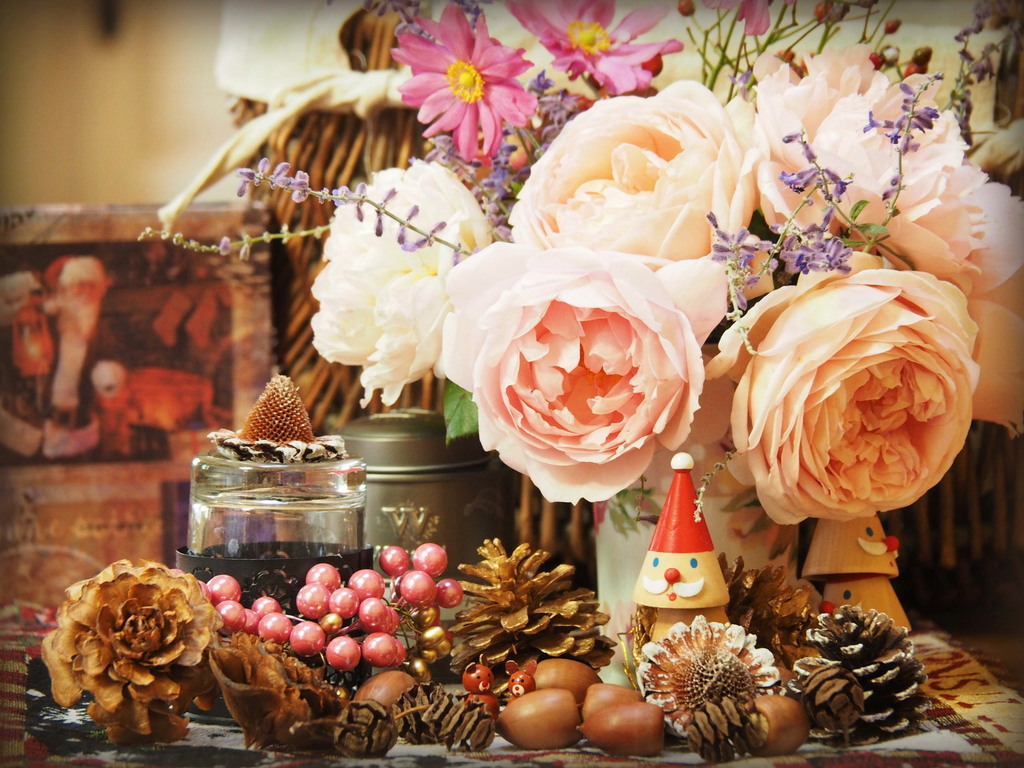 心が温まるような、バラと小物のレイアウトですね。クリスマス準備もバリエーション豊富で楽しそう。^^