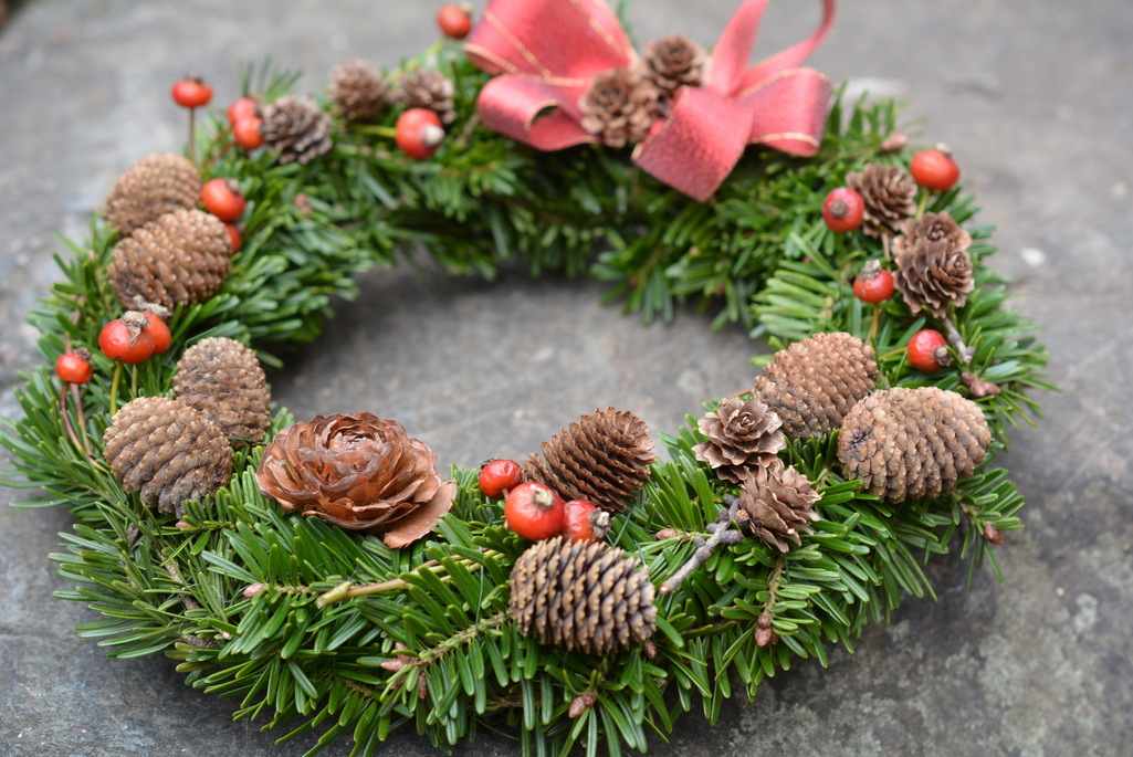 拾い集めたモミの木の枝・木の実で作ったリース。