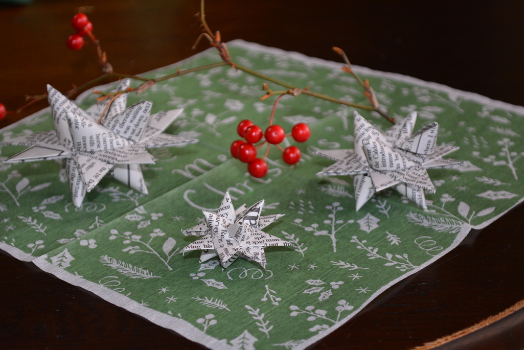 包装紙を切って作った星飾り。この冬 凝っています。何個作ったことか・・。