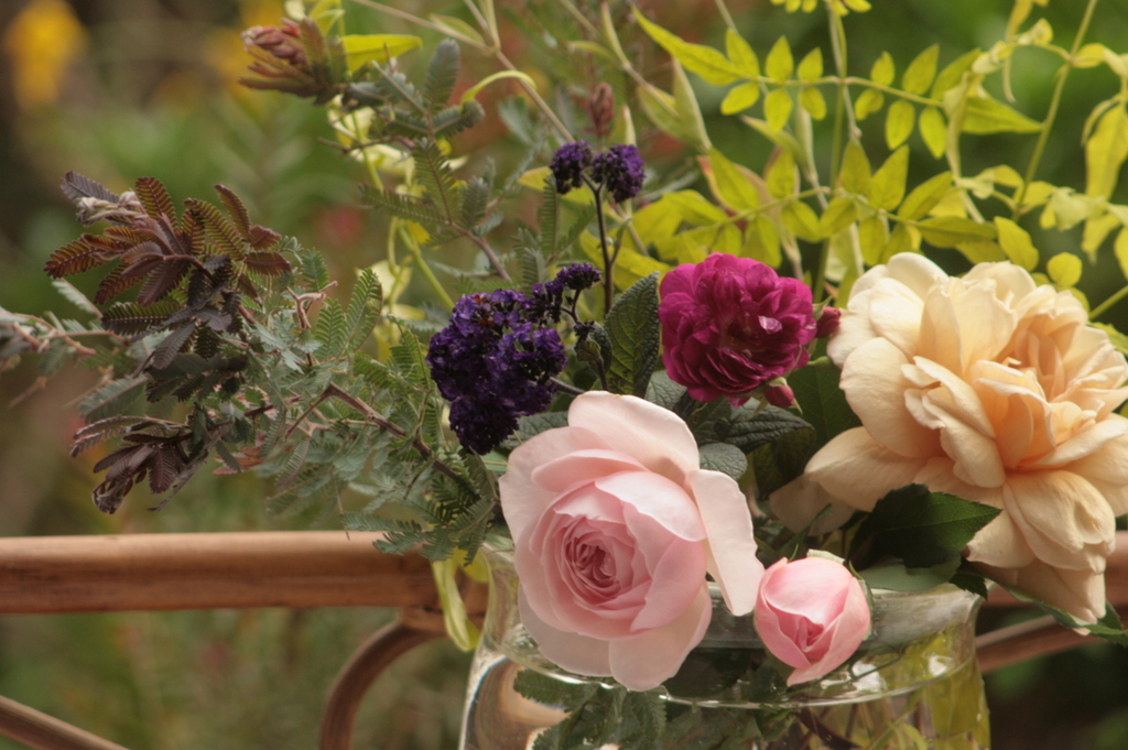 ぽつぽつと咲いたバラを集めて・・甘い香りのヘリオトロープも。