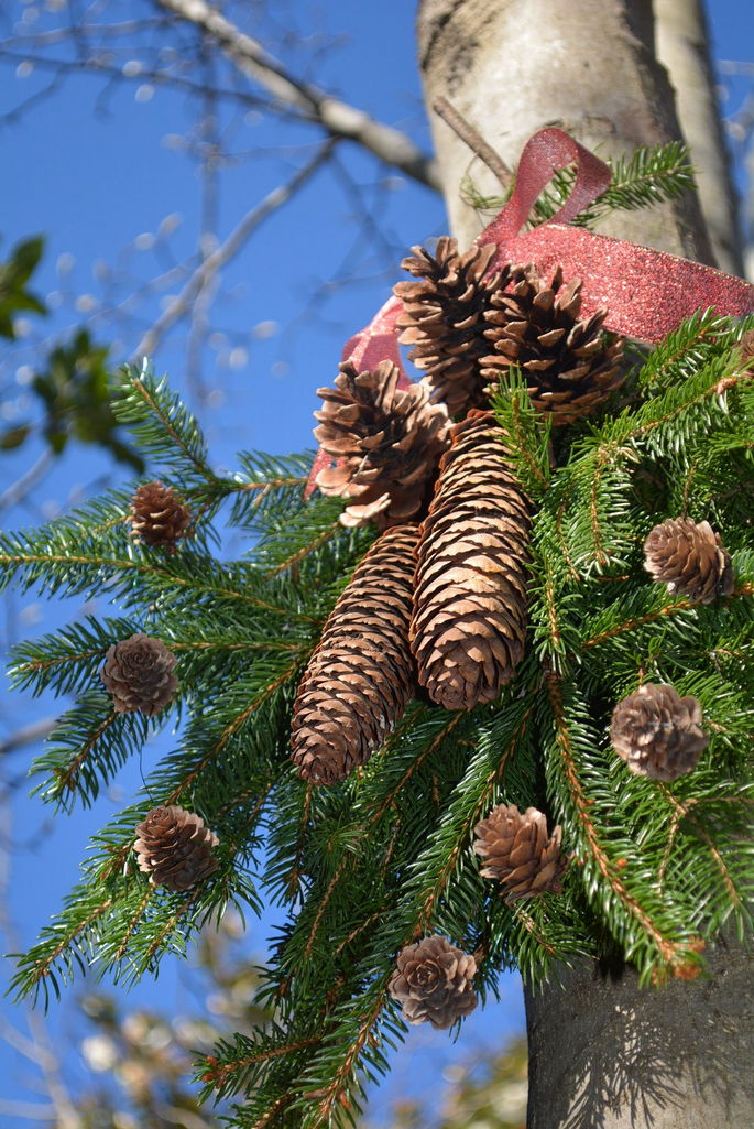 庭のドイツトウヒの枝を切り落としました。縛ってスワッグに。コブシの木にぶら下げています。