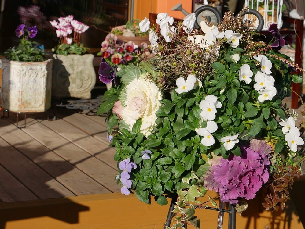 手作りハンギングバスケットとプレミアムなビオラなどで冬にも彩りを。