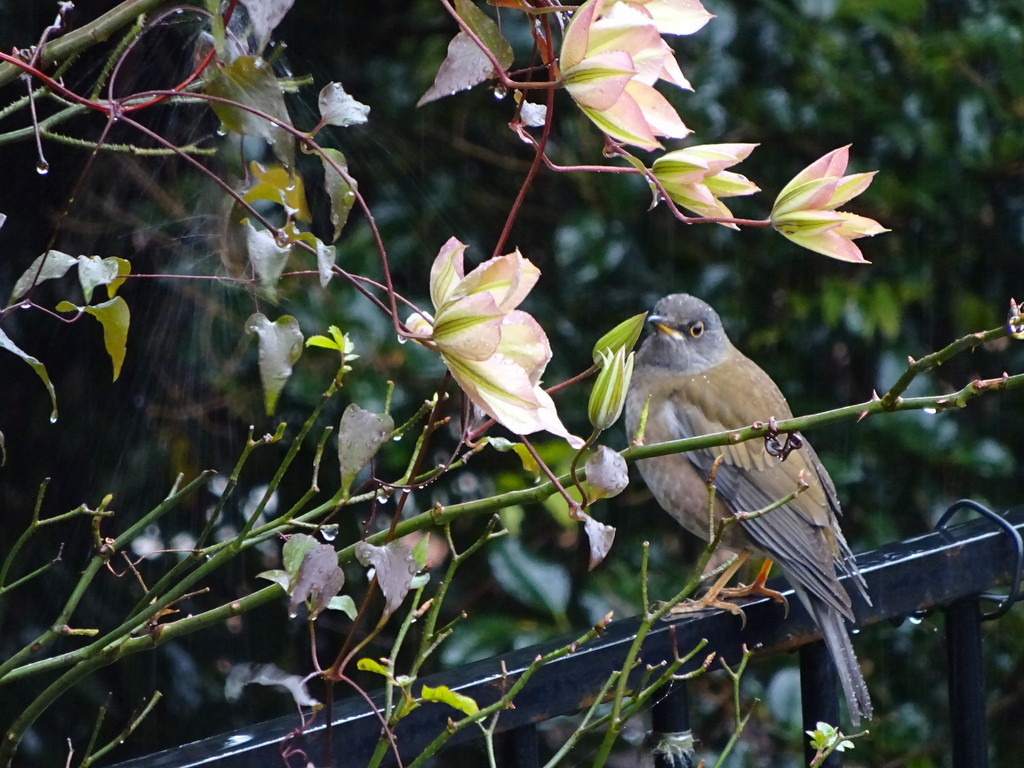 シロハラ君、今冬もやってきました!クレマチスをバックにカメラ目線で。すっかり馴染んでいるので昨年の鳥かも・・たぶん。ロシアや中国東北部沿岸で繁殖し日本へは冬、渡ってきます。春まで毎日楽しませてくれそうです。