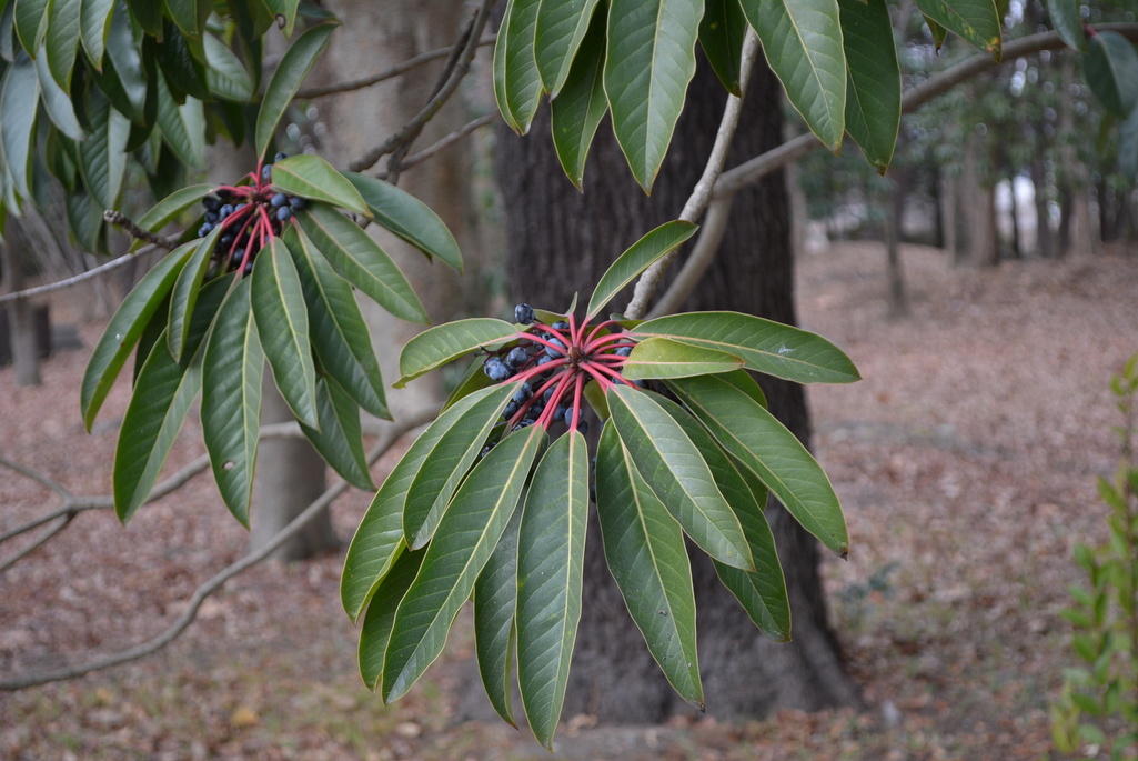 ブルーベリーのような実をたくさんつけていました。鳥がついばんだのか落ちている実もたくさん。