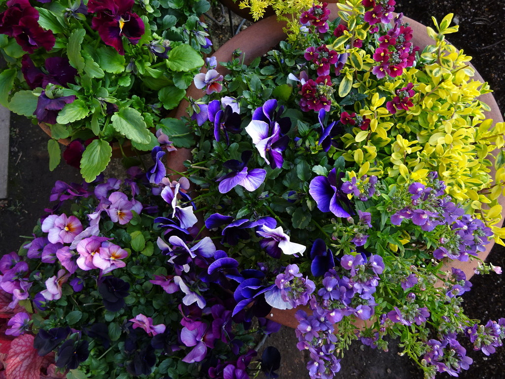 昨年末植えこんだ寄せ植え・・冬の間も楽しんだネメシア、ビオラはこれからが本領発揮!特に斑入りブルーデージー(金星)の葉は魅力的。