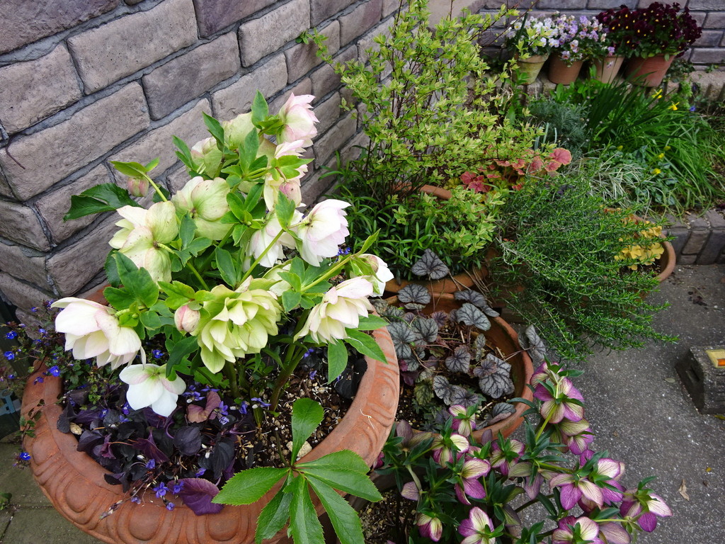 玄関前 駐車場は地植えができないのでコンテナを並べています。数が多いのでできるだけナチュラルに。