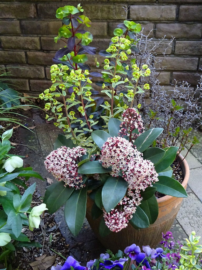 スキミアやユーフォルビアの花が咲きはじめボリュームがでてきました。