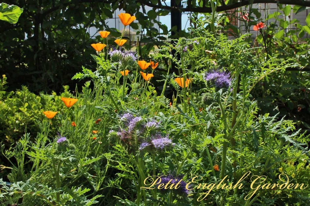 ファセリアの青い花と、鮮やかな黄色のカリフォルニアポピー