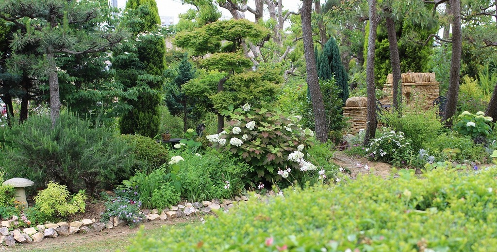 いろんな形や色の緑が梅雨の季節は雨に濡れてきれいにみえます