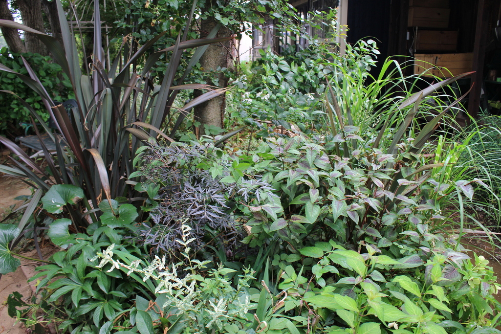 ニワトコ、サイラン、ヤマアジサイが咲くシェードガーデン