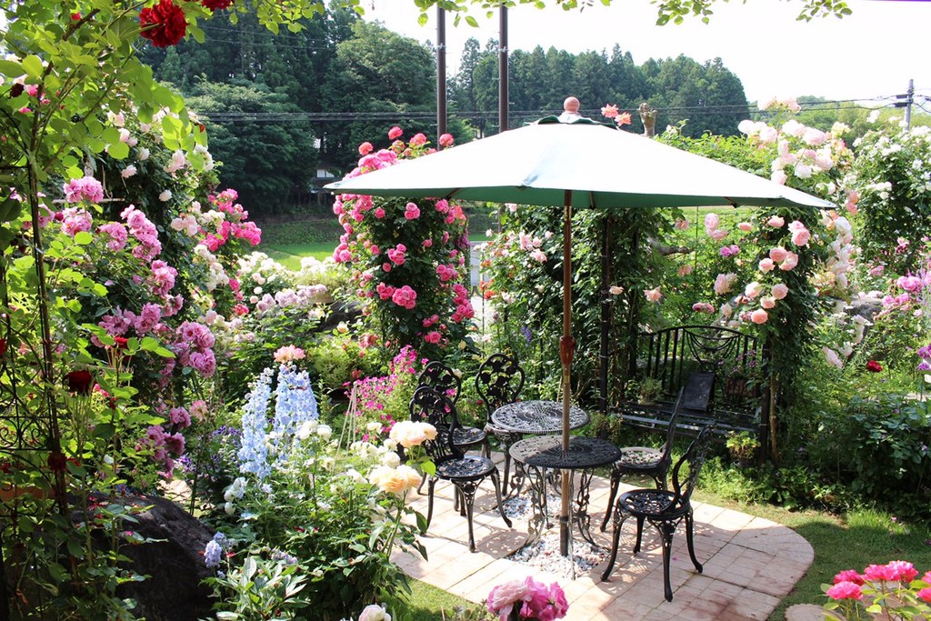 バラに囲まれた素敵な手作りのテラスでリラックスできそうですね。