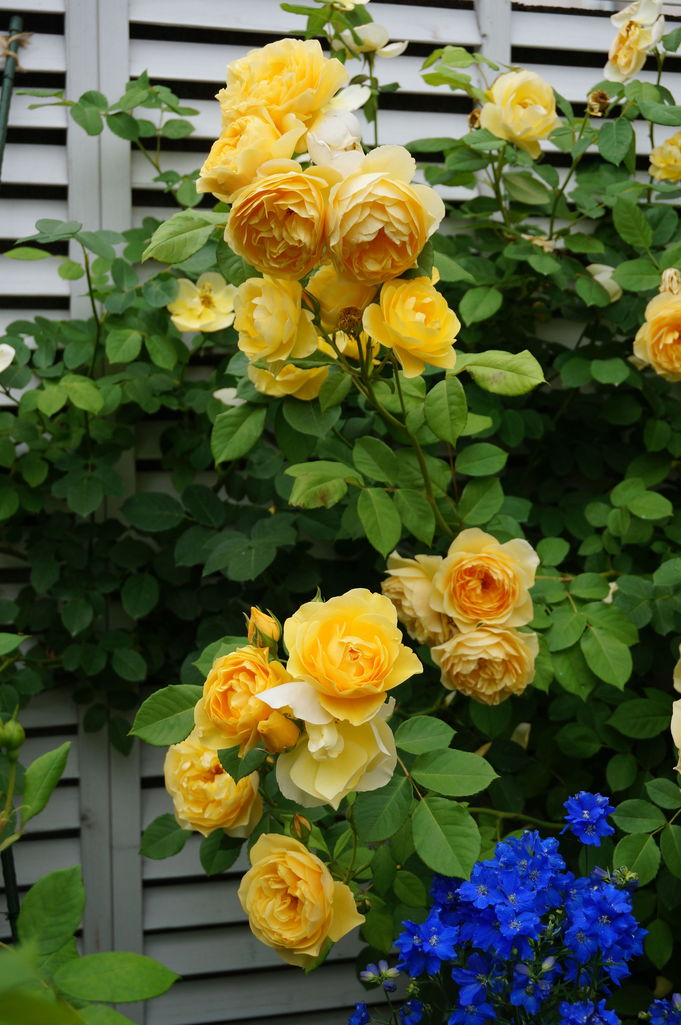 デルフィのブルーとグラハムトーマスの優しい黄色が何とも言えない味わいですね。いつも、無難に、ブルー、ピンクでまとめている私にとって参考になります。