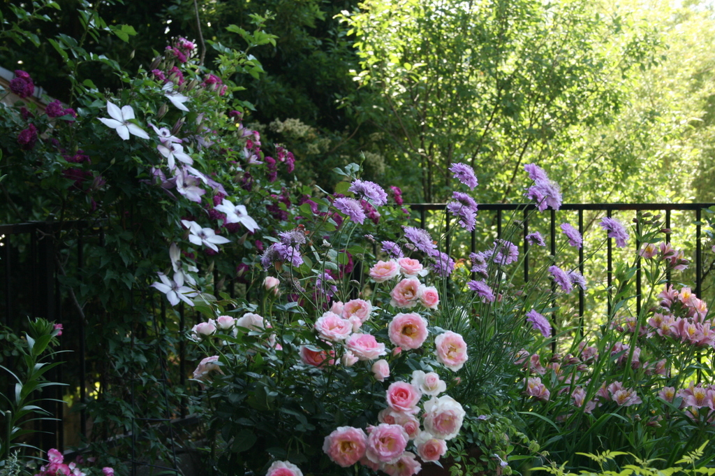 日陰の時間帯の花々がしっとりとしていて私も好きです。旭でしょうか。気持ちよさそうですね。