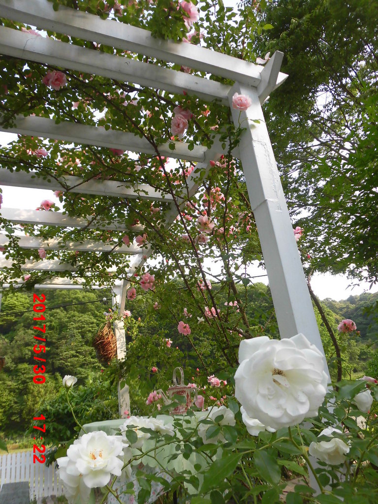 パーゴラに勢いよく伸びてたくさんの花を咲かせてくれて、いいバラですね。