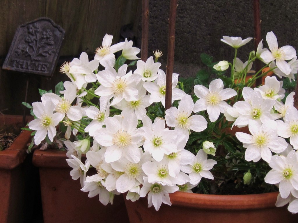 常緑クレマチス、柳の枝で長い支柱を立てたのにあまりツルが伸びないタイプのようでした。