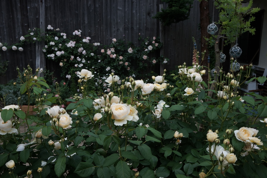 我が家のシンボルローズとも言えるERウインダミアです。 海をテーマにピンクのつるバラは夕陽に染まる海、手前の白いバラで波打ち際を表現しています。 今年もよく咲いてシトラスの良い香りが漂っていました。