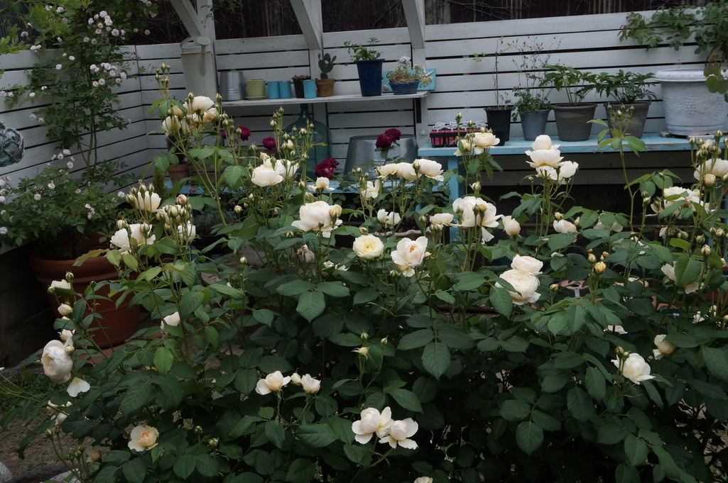 お久しぶりです。パーゴラに作業台自作ですか!ウインダミアも健康な葉っぱにたくさんの蕾、お庭の充実ぶりがうかがえます。
