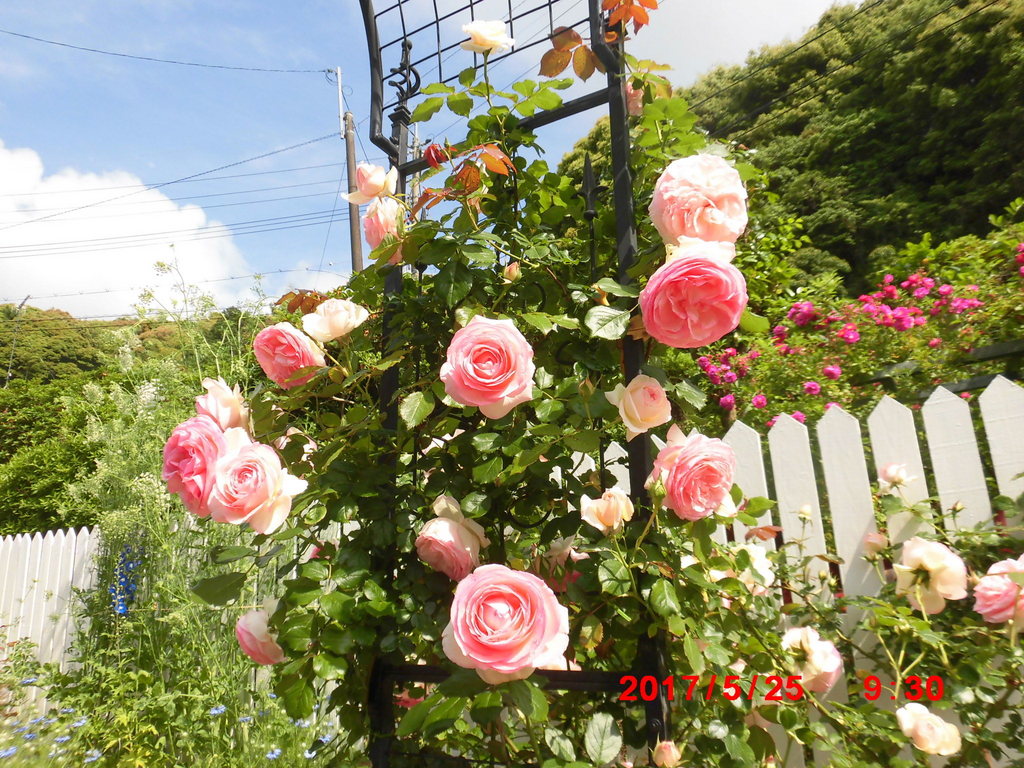2年目もピエールドロンサールにやっとアーチが取り付けられました。主人と孫の手伝いで組み立てたものです。この位置は玄関に入る前、門扉からの眺めにと場所を決めました。