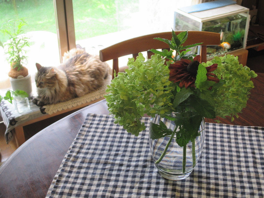 夏,猫,アナベル,ルドベキア,
